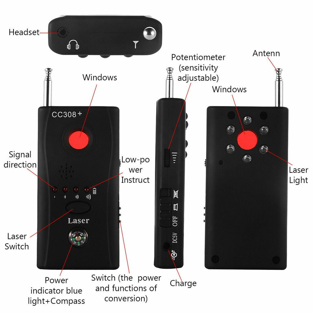 تحقق مما إذا كان منزلك مكتبك أو مكان عملك متصلاً بأي جهاز اكتشف ما إذا كانت سيارتك متصلة بجهاز مثل جهاز تعقب GPS كشف الإشارات اللاسلكية من الهواتف المحمولة والإنترنت كشف معدات التسجيل في المراحيض العامة وغرف الفنادق والأنشطة الترفيهية وما إلى ذلك. كاشف كاميرا عدسة الكاميرا